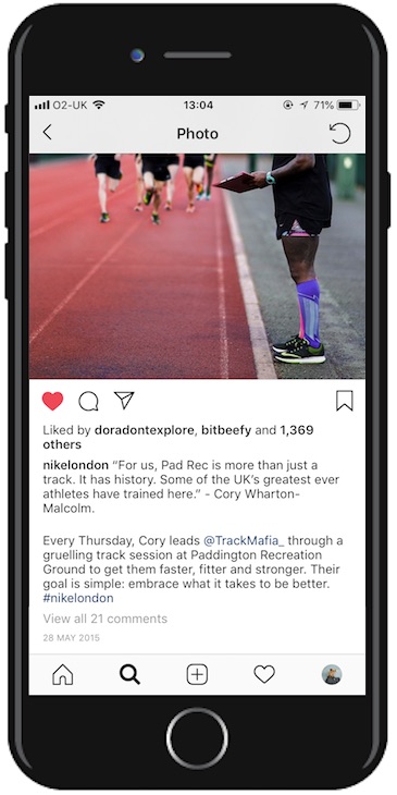 Idea generated and conceptualised posts, and wrote supporting copy for Nike’s first European city Instagram account, @nikelondon. The channel was launched to inspire movement in London.