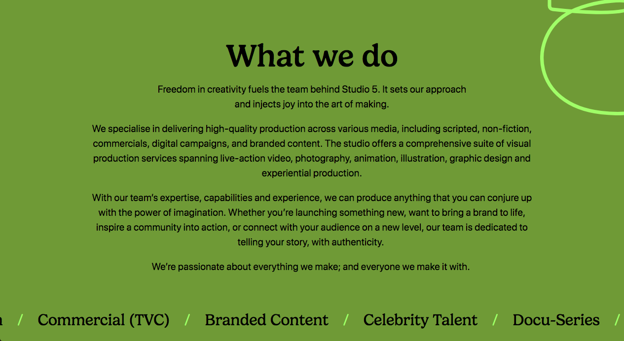 Establish tone of voice for the launch of creative agency, Studio 5 to reflect their values, personality and service offerings. The studio operates in both the UK and the US in a highly crowded market, so help them stand out by striking a balance between being unique and being clear about who they are.